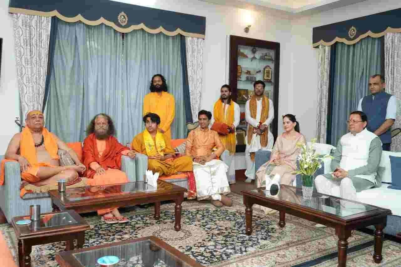मुख्यमंत्री आवास में आध्यात्मिक संगम में जगद्गुरु शंकराचार्य राजराजेश्वर महाराज, आचार्य महामंडलेश्वर कैलाशानंद गिरी जी महाराज, जूनापीठाधीश्वर आचार्य महामंडलेश्वर स्वामी अवधेशानंद गिरि जी,परमार्थ निकेतन, ऋषिकेश के अध्यक्ष पूज्य स्वामी चिदानंद सरस्वती जी,अखाड़ा परिषद अध्यक्ष स्वामी रविंद्रपुरी महाराज, बागेश्वर धाम पीठाधीश्वर पं. धीरेंद्र कृष्ण शास्त्री,पतंजलि योगपीठ के आचार्य बालकृष्ण,प्रसिद्ध आध्यात्मिक वक्ता जया किशोरी,चिंतक और लेखक डॉ. कुमार विश्वास सहित अनेकों प्रतिष्ठित संत-महात्मा एवं धर्माचार्य भेंट करने वाले प्रमुख संत-महात्माओं में शामिल रहे |